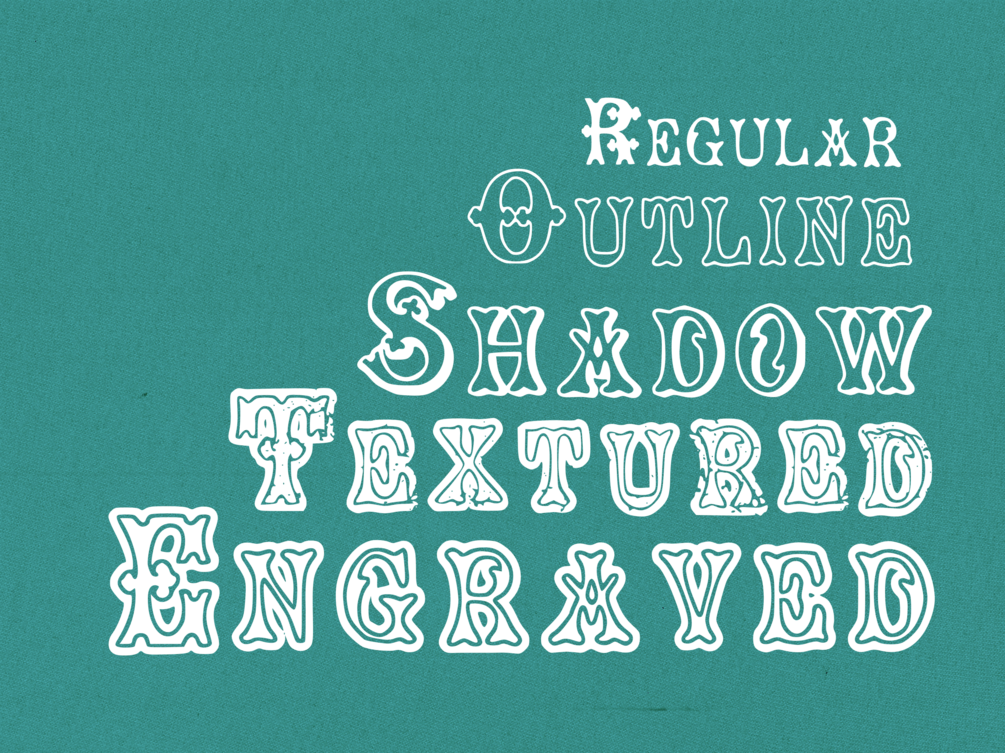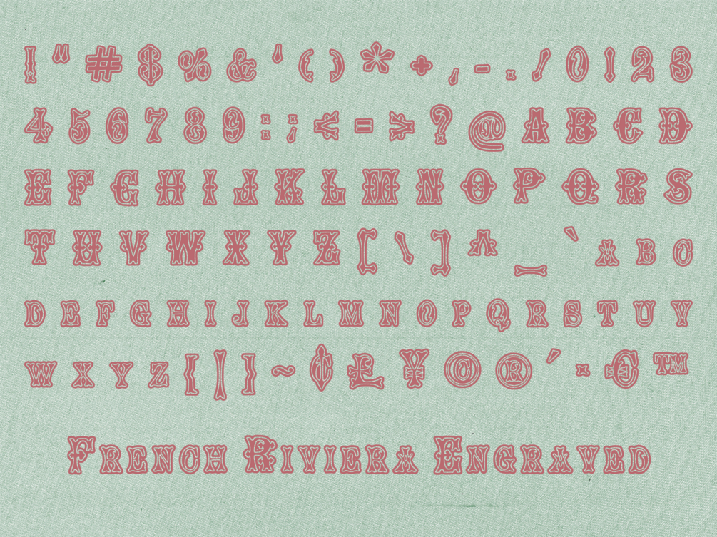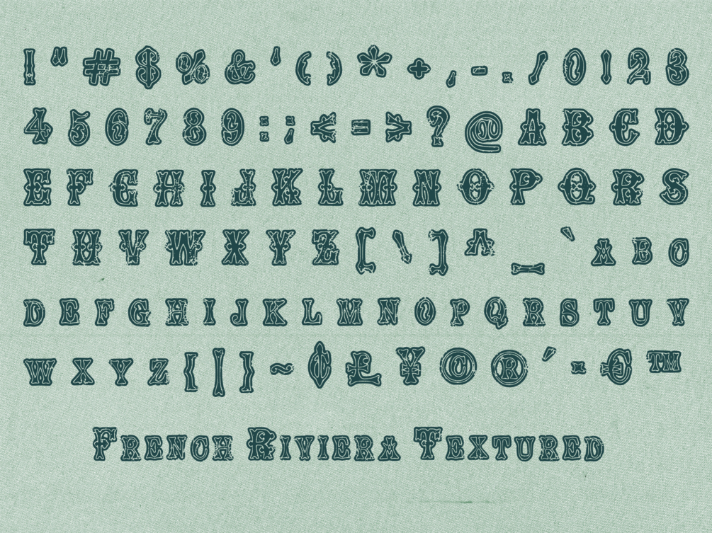 French Riviera is a vintage display font stylistic of the typefaces notable in French sign lettering seen in past centuries. It is versatile display font perfect for giving your designs an antique, elegant flare. Made up of 5 typefaces featuring a regular, textured, shadow, outline, and engraved version.